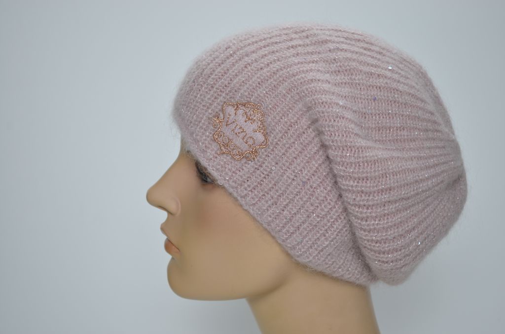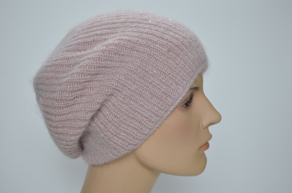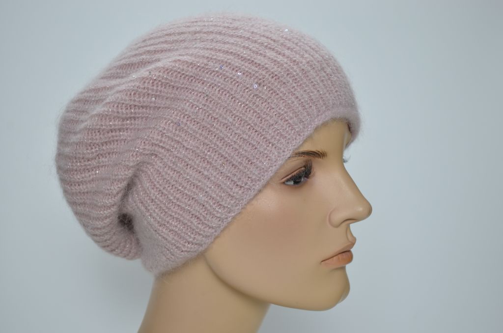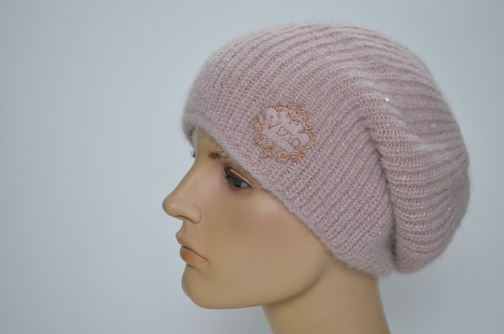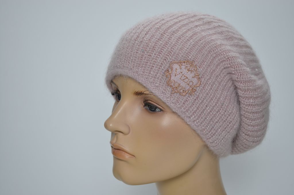 Женский берет зимний вязаный розового цвета из мохера и альпака